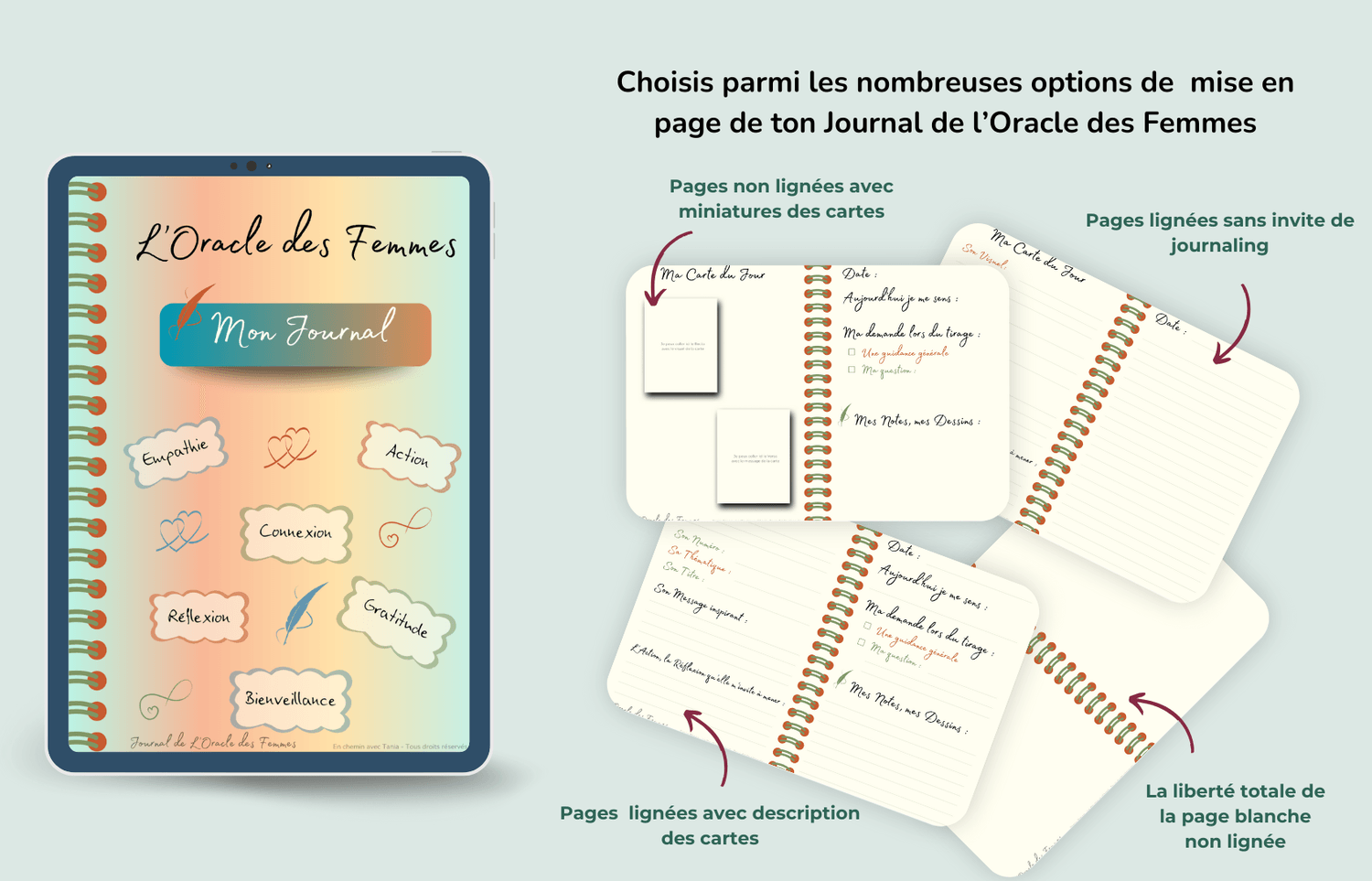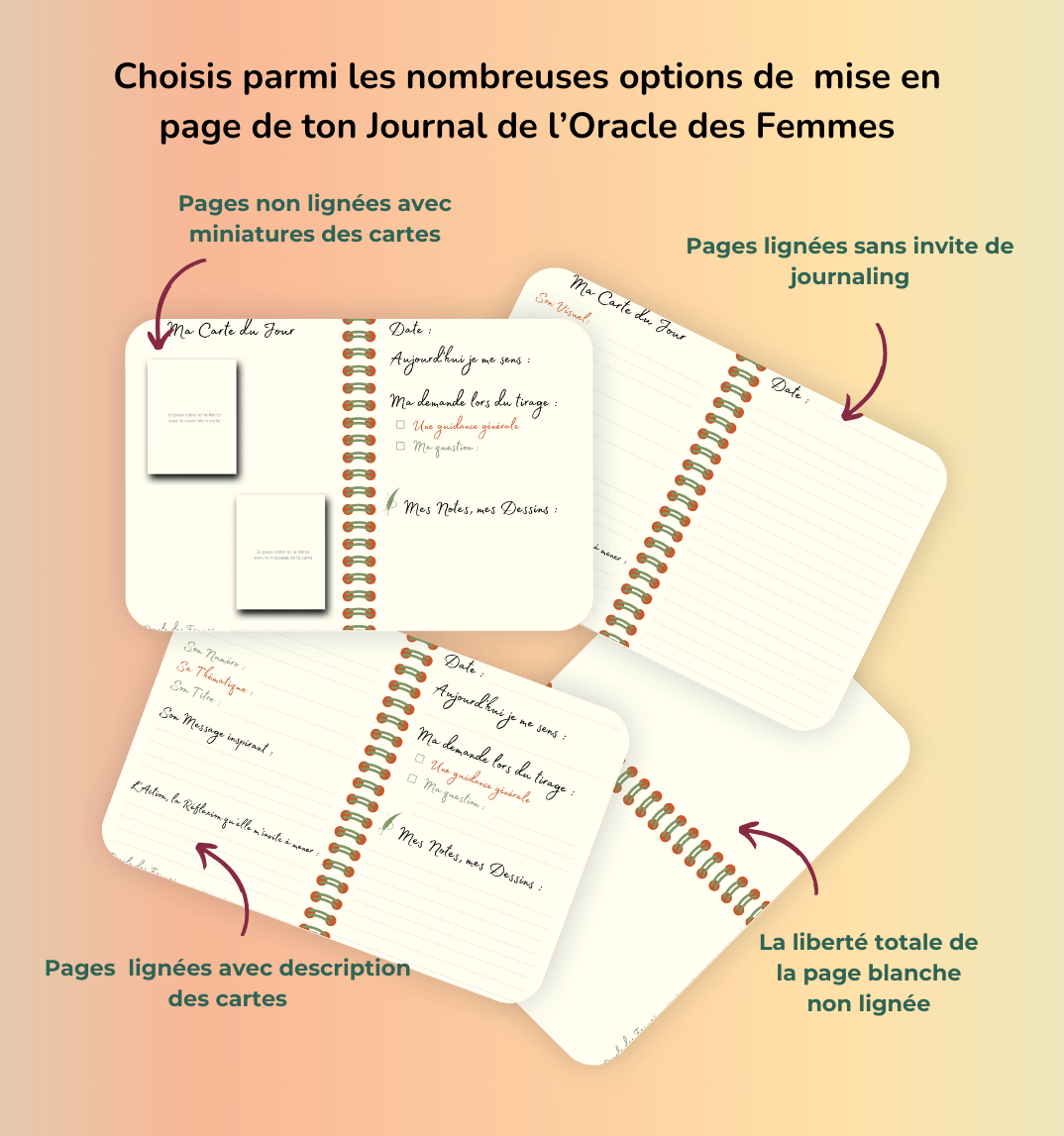 Un journal coordonné à l’Oracle des Femmes : tu vas pouvoir choisir parmi plusieurs options de mise en page celle qui TE correspond pour noter tes tirages, tes ressentis et les messages des cartes au fil des jours.