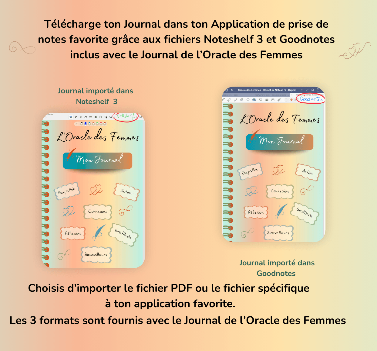 Tu peux importer ton Journal de l’Oracle directement dans ton application de prise de notes favorite : les versions spécifiques GoodNotes et Noteshelf 3 sont incluses