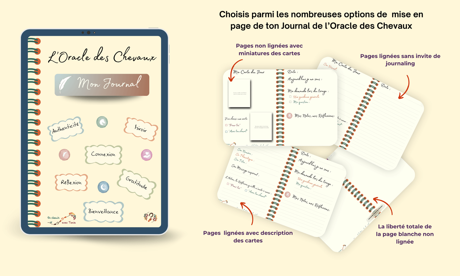 Un journal coordonné à l’Oracle des Chevaux : tu vas pouvoir choisir parmi plusieurs options de mise en page celle qui TE correspond pour noter tes tirages, tes ressentis et les messages des cartes au fil des jours. La version PDF peut être importée dans n'importe quelle application de prise de notes