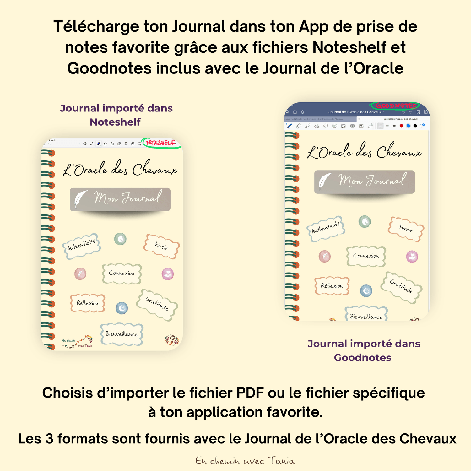 Tu peux importer ton Journal de l’Oracle des Chevaux directement dans ton application de prise de notes favorite : les versions GoodNotes et Noteshelf 3 sont incluses. Choisis le format qui te convient et commence à écrire sans plus attendre