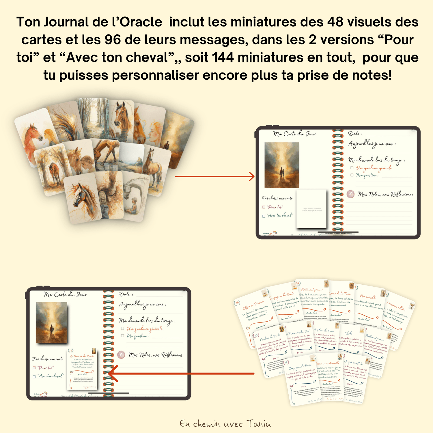 Retrouve les visuels des 48 cartes et leurs messages en version "Avec ton cheval" et "Pour toi" en miniature pour personnaliser ton journal.