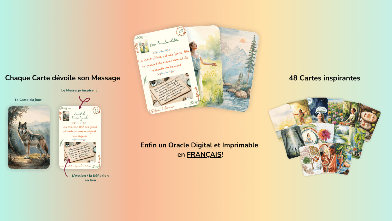 Un mode d’emploi clair pour télécharger l’oracle sur support digital ou l’imprimer, avec des conseils d’ancrage et des indications pour préparer ton tirage et poser ton intention