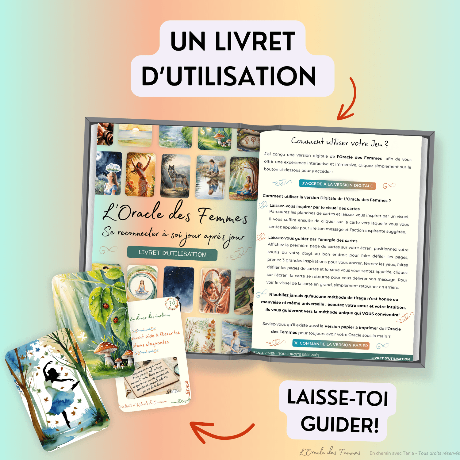 💡 Le Livret d’utilisation t’accompagne pas à pas pour installer et utiliser ton oracle sur support digital, en toute simplicité et la vidéo te montre en image comment faire et comment j’effectue mes tirages, avec les cartes papier et sur ma tablette.