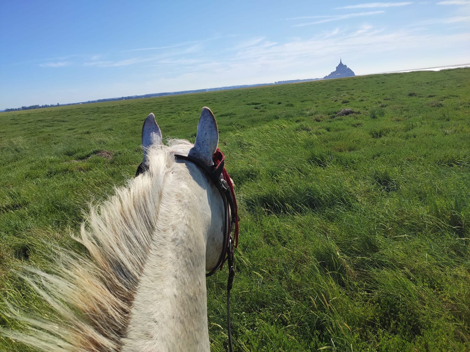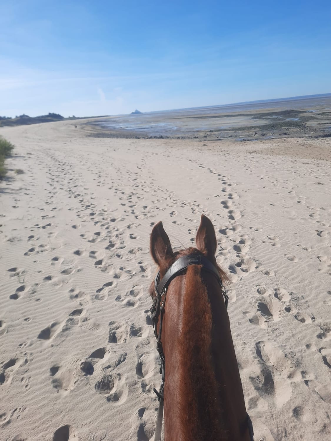 le bruit des sabots sur le sable, l’espace autour de soi, la silhouette du Mont qui accompagne la traversée.