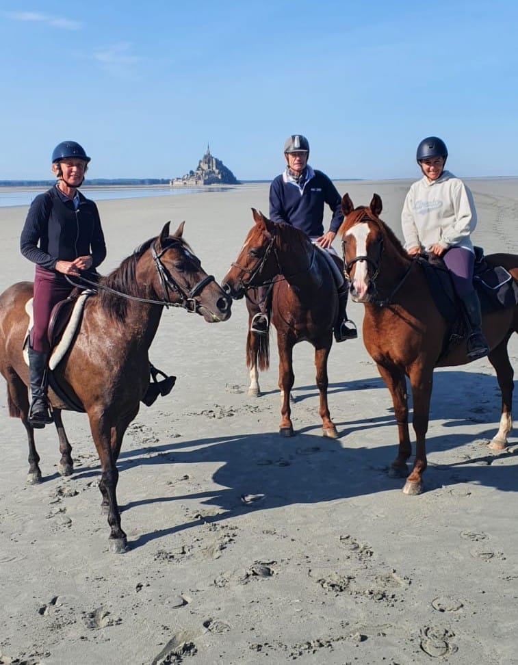 Le groupe est accompagné par deux Accompagnateurs de Tourisme Équestre diplômés ainsi que par un guide spécialisé de la baie, qui connaît parfaitement les itinéraires et les conditions de marée.