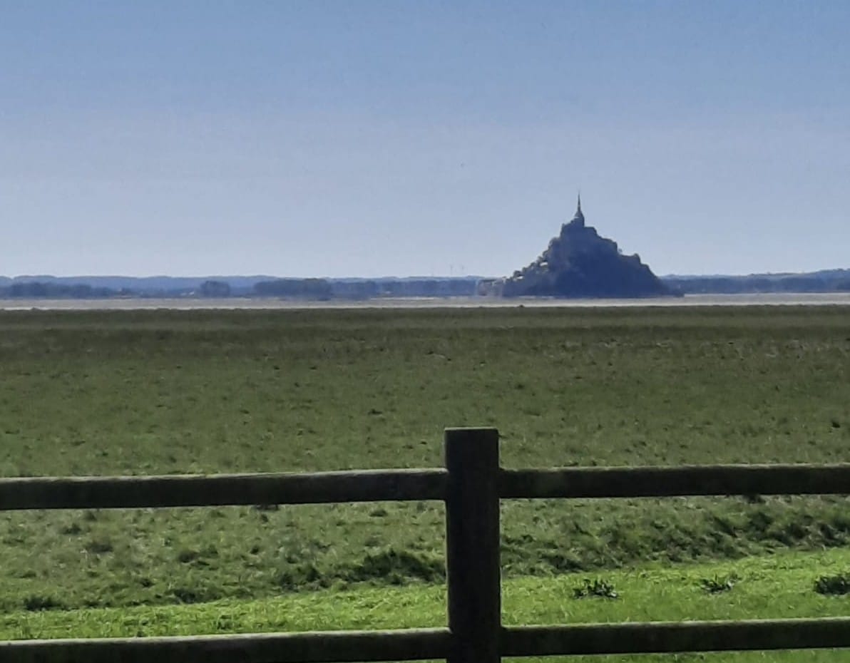Peu à peu, le Mont apparaît dans le paysage, posé entre les grandes étendues de sable et la ligne de l’horizon.